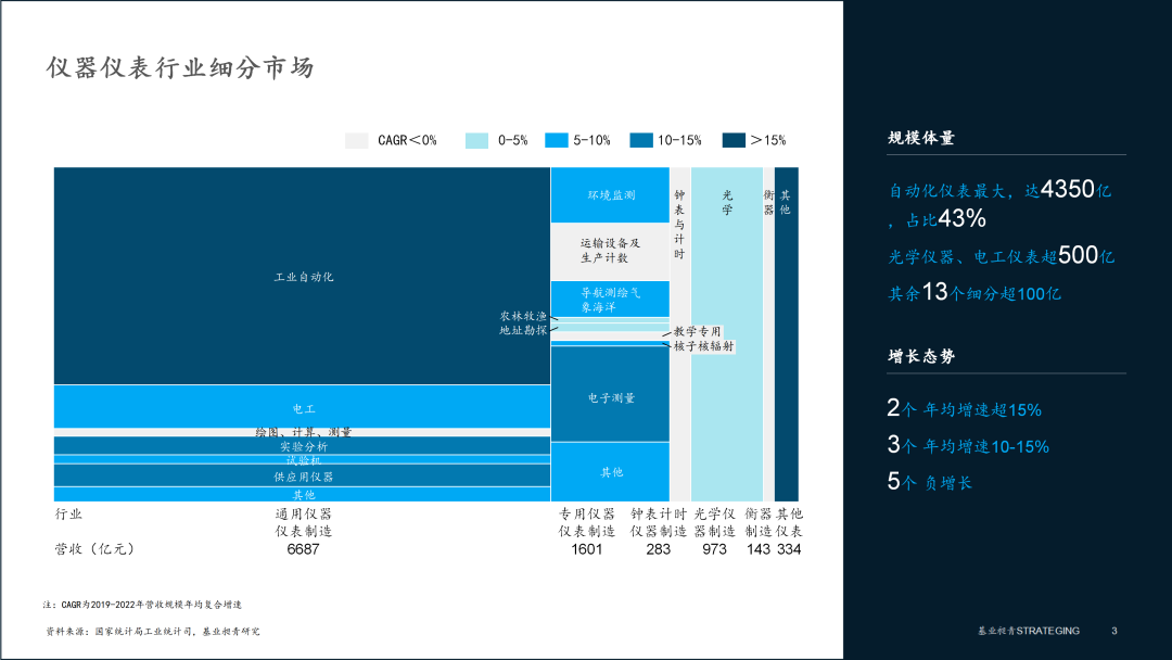 規(guī)模體量上,20個小類中,多數(shù)規(guī)模體量較小,自動化儀表規(guī)模最大,2022年規(guī)上企業(yè)營收達(dá)4350億,占整個儀器儀表行業(yè)比重為43%,光學(xué)儀器、電工儀表超500億,其余13個細(xì)分超100億。增長態(tài)勢上,穩(wěn)健低增長為主,2個年均增速超15%,3個年均增速10-15%,5個負(fù)增長。