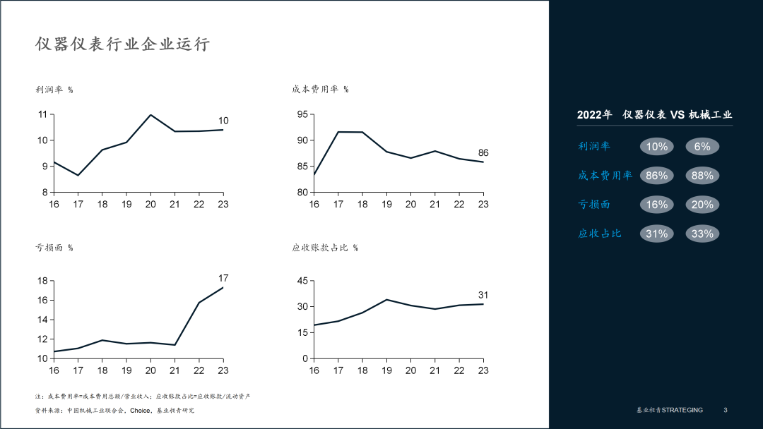 儀器儀表行業(yè)整體運(yùn)行穩(wěn)定向好。2023年行業(yè)成本費(fèi)用率86.44%,利潤率達(dá)10.35%,是機(jī)械工業(yè)14大行業(yè)中唯二的利潤率超10%的行業(yè),近幾年也在持續(xù)穩(wěn)步提升;虧損面自2022年起由絕對低位快速擴(kuò)大,2023年至17.30%,部分受疫情反復(fù)導(dǎo)致,但整體仍處于一個較低水平,應(yīng)收賬款占流動資產(chǎn)比重微升至31.40%。