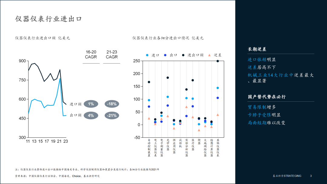 由于高端儀器儀表設(shè)備依賴進(jìn)口,我國儀器儀表產(chǎn)品長期處于進(jìn)出口貿(mào)易逆差狀態(tài),是機(jī)械工業(yè)14大行業(yè)除新興的機(jī)器人與智能制造行業(yè)外,逆差最大、最顯著的行業(yè)。2023年儀器儀表行業(yè)進(jìn)出口總額為1030億美元,進(jìn)口額為558億美元。這其中,實(shí)驗(yàn)分析儀器、 光學(xué)儀器、醫(yī)療儀器、工業(yè)自動控制系統(tǒng)及裝置和電子測量儀器逆差較大。目前國際形勢嚴(yán)峻,中美貿(mào)易摩擦升級,部分國家增加對中國的在高性能、高精度、高靈敏、高穩(wěn)定、高可靠的科學(xué)儀器的出口限制,國產(chǎn)替代勢在必行但也難度頗大,局面短時期內(nèi)還難以改變。