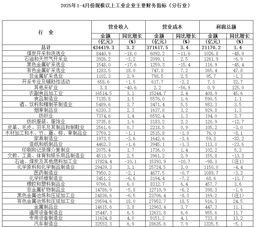 1-4月份,主要行業(yè)利潤情況如下:農(nóng)副食品加工業(yè)利潤同比增長45.6%,有色金屬冶煉和壓延加工業(yè)增長24.5%,電氣機(jī)械和器材制造業(yè)增長15.4%,專用設(shè)備制造業(yè)增長13.2%,通用設(shè)備制造業(yè)增長11.7%,計算機(jī)、通信和其他電子設(shè)備制造業(yè)增長11.6%,電力、熱力生產(chǎn)和供應(yīng)業(yè)增長5.6%,紡織業(yè)增長3.7%,非金屬礦物制品業(yè)下降1.6%,化學(xué)原料和化學(xué)制品制造業(yè)下降4.4%,汽車制造業(yè)下降5.1%,石油和天然氣開采業(yè)下降6.9%,煤炭開采和洗選業(yè)下降48.9%,石油煤炭及其他燃料加工業(yè)同比增虧,黑色金屬冶煉和壓延加工業(yè)同比由虧轉(zhuǎn)盈。