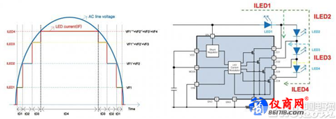 圖2顯示了DACD方案的基本工作模式。當(dāng)交流線路電壓通過(guò)半正弦時(shí),IC內(nèi)的開關(guān)指示電流(ILEDn)照亮每個(gè)LED。但這種線性開關(guān)法有一個(gè)主要的缺點(diǎn),即高THD。