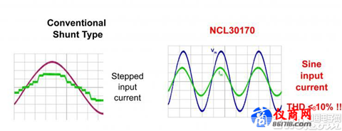 NCL30170用一種專有的方法來(lái)調(diào)節(jié)電流,而不是用于傳統(tǒng)DACD方案的線性方法。電壓觸發(fā)點(diǎn)保持不變,但以這樣一種方式調(diào)節(jié)電流使其不再是一個(gè)階梯形狀,從而產(chǎn)生平滑的正弦波電流(如圖4右圖所示),導(dǎo)致低于10%的極佳的THD水平。