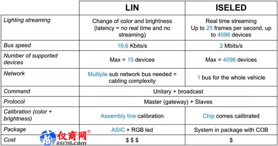 目前車載氛圍燈應(yīng)用主要以LIN總線架構(gòu)為主,實現(xiàn)車內(nèi)網(wǎng)絡(luò)布局。但受制于LIN總線特性,存在一定局限性,如圖1所示。傳統(tǒng)LIN節(jié)點方式通過LIN Switch功能級聯(lián)各節(jié)點,受限于架構(gòu)和通訊速率,單LIN節(jié)點數(shù)最大支持15個節(jié)點。如果車內(nèi)全空間布置,則需要多個子LIN網(wǎng)絡(luò),通過LIN網(wǎng)關(guān)節(jié)點整合管理。而ISELED使用高達(dá)2M的差分信號傳輸,同時可支持的單鏈節(jié)點數(shù)高達(dá)4096個。更加方便整車布局及更優(yōu)的性價比。