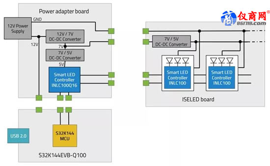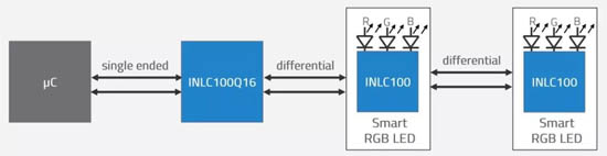 ISELED方案主要分三部分組成:主控制器、供電與接口、LED節(jié)點。如圖3所示,考慮到整車裝配情況要求,一般推薦主控制、供電與接口為一體,LED節(jié)點靈活裝配。INLC100Q16/INLC100集成通訊收發(fā)器,將主控制器的邏輯信號電平轉(zhuǎn)化為差分信號進(jìn)行節(jié)點傳輸,收發(fā)器接口耐壓等級與Vbat耐壓一致,可應(yīng)用于車內(nèi)器件板間通訊連接。