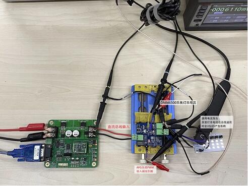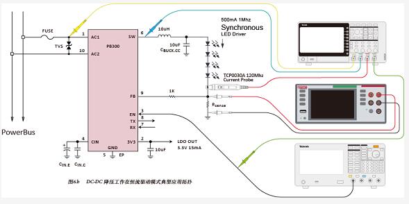 本文案例是一個客戶需要快速測量PWM調(diào)光時的輸出電流線性度和平滑度,進而再進積分球測試亮度線性度。被測器件是一款集成度極高,具備恒壓或恒流輸出的雙模式BUCK和無極性接入的載波二總線芯片。同時客戶又擔心這種具備總線功能的調(diào)光芯片,在總線通訊時會不會對LED調(diào)光產(chǎn)生影響。而Buck部分高達1MHz的開關(guān)頻率,同時又為電流測量帶來了不小的挑戰(zhàn)。本文選擇使用了TCP0030A探頭,此探頭可以達到120MHz帶寬,對于高速電流信號的測量非常合適。