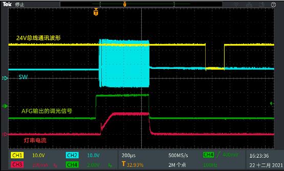 客戶隨后使用串口在二總線上傳輸MODBUS協(xié)議,使用MCU按照AFG給定的頻率控制燈串亮度,很快便設計完畢了一款照明燈的方案設計。
