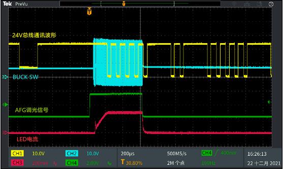 可見,在總線通訊波形快速變化時,燈串電流依然沒有任何的毛刺或者上下過沖。