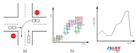 圖2. a) 一種典型的城市駕駛場景; b) 分配任務(wù)的時空排列; c) 隨時間變化的相應(yīng)計算開銷