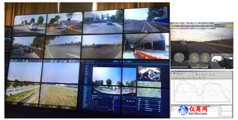 青島慧拓智能機器有限公司聯(lián)合清華大學(xué)一起開發(fā)了自動測評系統(tǒng)并成功應(yīng)用于此次比賽中。如圖10所示,左邊展示的是正在比賽中的5輛車的實時軌跡和實時排名,右邊屏幕里是實時的視頻回傳數(shù)據(jù),展示著裁判車數(shù)據(jù),比賽車輛數(shù)據(jù),以及場邊攝像頭數(shù)據(jù)。這些數(shù)據(jù)通過V2X或者4G的方式傳回數(shù)據(jù)中心。