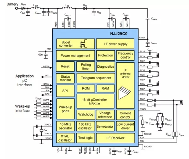 利用升壓轉(zhuǎn)換器可支持6路LF線圈,支持一路IMMO和PKE定位的線圈可以共用;