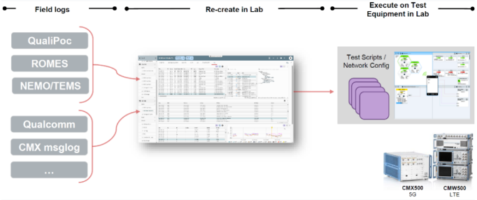 方案二主要包括外場移動網(wǎng)絡(luò)掃頻軟件“Romes”,掃頻儀和圖形化外場網(wǎng)絡(luò)信號復(fù)現(xiàn)編輯軟件”CM360°“,最后通過生成的測試腳本將外場網(wǎng)絡(luò)信號導(dǎo)入CMW/CMX500網(wǎng)絡(luò)模擬器中進(jìn)行測試。通過外場路測采集客戶投訴較多地方的網(wǎng)絡(luò)信號(包括小區(qū)參數(shù)SIB系統(tǒng)消息,L3層信令消息信令流程,小區(qū)信號強(qiáng)度動態(tài)變化)生成log并在實(shí)驗(yàn)室復(fù)現(xiàn)分析,集中定位問題和解決客戶的投訴。