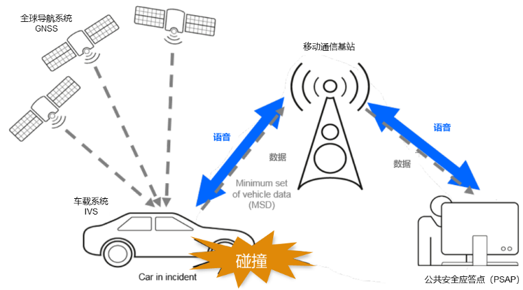 eCall基本上由三個(gè)重要系統(tǒng)組成:車載電子系統(tǒng)(IVS,車載遠(yuǎn)程信息處理系統(tǒng)的組成部分),電話通信網(wǎng)絡(luò)(移動(dòng)電話加固定網(wǎng)絡(luò))和緊急呼叫中心(公共安全應(yīng)答點(diǎn)PSAP)。當(dāng)事故發(fā)生觸發(fā)特定事件時(shí)(例如安全氣囊彈出),IVS 就會(huì)將收集到的數(shù)據(jù)集(MSD, Minimum Set of Data),如車牌號(hào)、位置信息等通過(guò)BBPM的語(yǔ)音電話方式發(fā)送給公共安全應(yīng)答中心PASP,PASP在解析MSD之后啟動(dòng)救援服務(wù)。