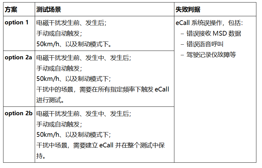 ? 對(duì)被測(cè)車輛進(jìn)行干擾測(cè)試(EMS),并在干擾發(fā)生前和干擾后,驗(yàn)證eCall功能的正確執(zhí)行(option 1)