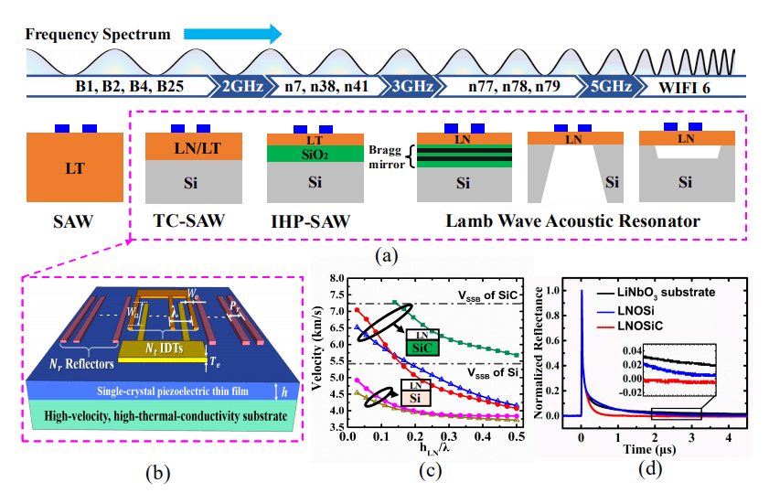 圖1(a)SAW濾波器向高頻、大寬帶方向發(fā)展的路線圖;(b)基于高聲速、高導熱壓電異質襯底的濾波器芯片示意圖;圖(b)所示壓電異質襯底的(c)聲速頻散特性曲線仿真結果和(d)瞬態(tài)熱反射曲線測試結果