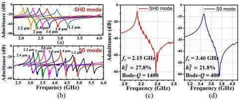 圖2(a)和2(b)所示實驗結果表明該異質襯底可有效激發(fā)SH0模式和S0模式,其對應諧振器的工作頻率可覆蓋2.0~4.72 GHz頻段,機電耦合系數(shù)大于20%。通過調整壓電薄膜厚度和目標模式波長的比值,可進一步降低或提高器件工作頻率和機電耦合系數(shù)。圖2(c)所示實驗結果為典型SH0諧振器的導納響應,其兼顧較高的工作頻率、較大的機電耦合系數(shù)和Bode-Q。圖2(d)所示實驗結果為典型S0諧振器的導納響應,其諧振頻率大于3.3GHz,機電耦合系數(shù)大于20%,基本滿足5G應用需求,后期將通過器件優(yōu)化設計提高其Bode-Q。