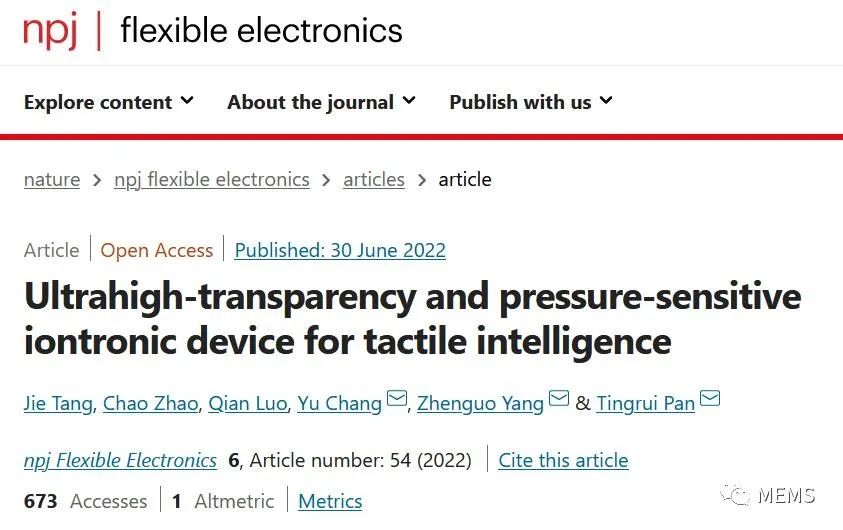 Tang, J., Zhao, C., Luo, Q. Chang, Y., Yang, Z., Pan, T., Ultrahigh-transparency and pressure-sensitive iontronic device for tactile intelligence. npj Flex. Electron., 6, 54 (2022).