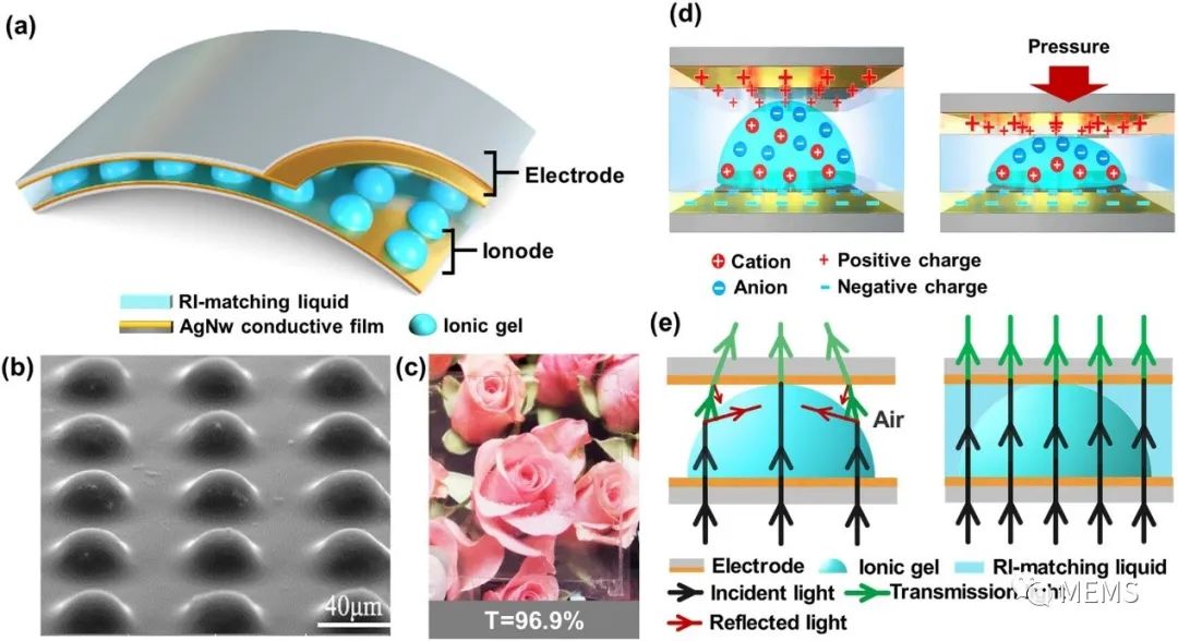 據(jù)麥姆斯咨詢報(bào)道,近日,中國(guó)科學(xué)技術(shù)大學(xué)蘇州高等研究院、中國(guó)科學(xué)院深圳先進(jìn)技術(shù)研究院與復(fù)旦大學(xué)緊密合作,基于高靈敏的離電傳感機(jī)理與折射率匹配策略,研發(fā)出當(dāng)前全球透明度最高的柔性觸覺傳感器件,從機(jī)理上解決了觸覺傳感中透光度與靈敏度相矛盾的問題,并提出了用于消費(fèi)電子及醫(yī)療健康領(lǐng)域的觸覺與視覺深度融合的智能方案。該論文題為“Ultrahigh-transparency and pressure-sensitive iontronic device for tactile intelligence”已發(fā)表在國(guó)際著名學(xué)術(shù)期刊:npj Flexible Electronics, 2022, 6, 54。常煜副研究員、潘挺睿教授和楊振國(guó)教授為該文章通訊作者,第一作者是唐杰博士。