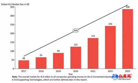 按照工業(yè)4.0的上述定義,目前整個市場估值為650億美元,預(yù)計到2023年將達到3380億美元,復(fù)合年均增長率(CAGR)為39%(見圖5).