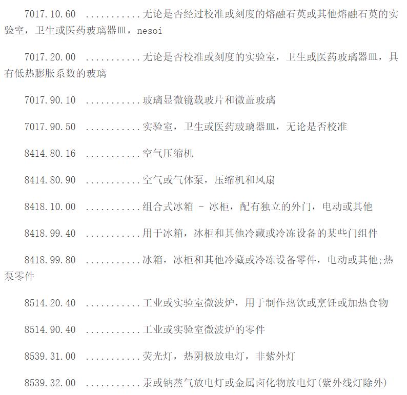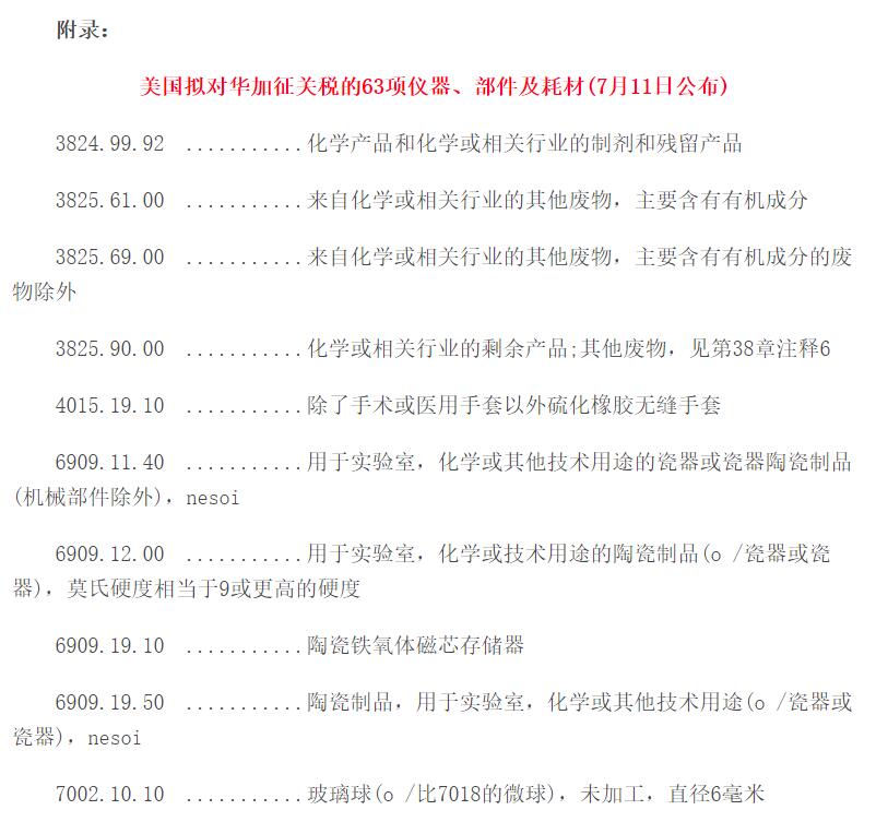 2018年7月11日特朗普政府曾公布一份長達(dá)195頁的對華征稅清單,擬對約2000億美元中國產(chǎn)品加征10%的關(guān)稅,包括數(shù)百種食品、香煙、服裝、化學(xué)制品、電視零部件、冰箱等消費品和其他科技產(chǎn)品,以及空氣壓縮機(jī)、實驗室微波爐、熒光燈、陰極射線管、天平等63項科學(xué)儀器、部件及耗材(詳見附錄)。