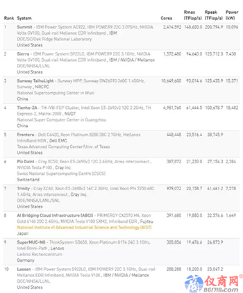 IBM 制造的兩臺超級計算機 Summit 和 Sierra,仍保持著前兩名的位置。它們的計算能力都由 power 9 cpu 和 NVIDIA V100 gpu 提供。與 6 個月前相比,Summit 系統(tǒng)的 HPL 性能略有改善,達到 148.6 petaflops 的記錄,而排名第二的 Sierra 仍然保持在 94.6 petaflops。兩臺頂尖超算分別安裝在美國能源部位于田納西州的橡樹嶺國家實驗室 (Oak Ridge National Laboratory, ORNL) 和加利福尼亞州的勞倫斯利弗莫爾國家實驗室 (Lawrence Livermore National Laboratory)。