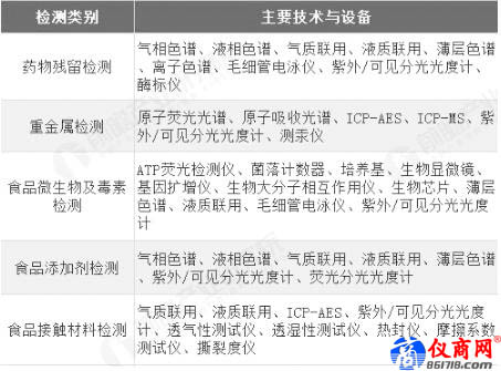 其中,食品安全檢測(cè)儀器主要是用來(lái)檢測(cè)、檢驗(yàn)和分析食品中有毒、有害物質(zhì)。根據(jù)食品安全檢測(cè)項(xiàng)目具體類(lèi)別來(lái)劃分,將檢測(cè)儀器劃分為藥物殘留檢測(cè)儀、重金屬檢測(cè)儀、食品微生物及毒素檢測(cè)儀、食品添加劑檢測(cè)儀、食品接觸材料檢測(cè)儀等五個(gè)類(lèi)別。