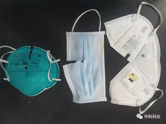 我們選用了N95醫(yī)用防護口罩(左一)、普通醫(yī)用口罩(左二)和3M顆粒物防護口罩(右一)作為本次實驗樣品。從過濾效果看:N95醫(yī)用防護口罩>3M顆粒物防護口罩>普通醫(yī)用口罩。