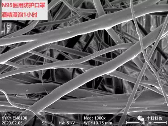 通過以上的電鏡圖片我們可以看到,熔噴無紡布的纖維雖然非常細(xì),但并不是那么脆弱,即使用酒精浸泡1小時,或是用沸水煮10分鐘,仍然能保持原有結(jié)構(gòu),纖維也沒有出現(xiàn)斷裂、變形或被腐蝕的現(xiàn)象。