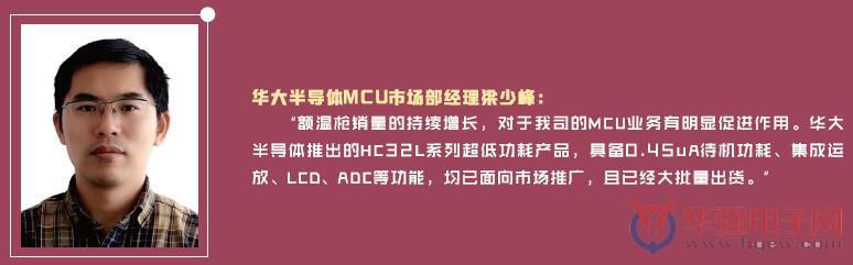 這也讓額溫槍設(shè)備的諸多供應(yīng)鏈廠商們嘗到了甜頭,尤其是在MCU領(lǐng)域的不少國內(nèi)主流廠商,紛紛涌入額溫槍市場“淘金”,華大半導(dǎo)體MCU市場部經(jīng)理梁少峰在接受記者采訪時表示:“額溫槍銷量的持續(xù)增長,對于我司的MCU業(yè)務(wù)有明顯促進(jìn)作用。華大半導(dǎo)體推出的HC32L系列超低功耗產(chǎn)品,具備0.45uA待機(jī)功耗、集成運(yùn)放、LCD、ADC等功能,均已面向市場推廣,且已經(jīng)大批量出貨?!?