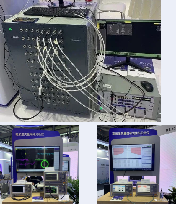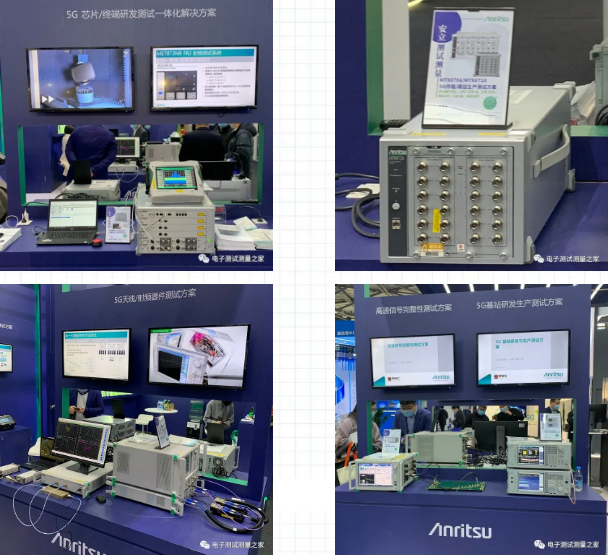 現(xiàn)場展臺還展出了安立最新發(fā)布的提升無線設(shè)備產(chǎn)線測試效率的MT8872A通用無線測試儀(下圖右上),該型號是與MT8870A完全兼容的2插槽儀表,可以節(jié)省安裝空間。新開發(fā)的測試模塊MU887002A則具有24個射頻接口,可安裝在MT8870A和MT8872A中,標準帶寬為200MHz,支持5G Sub-6 GHz 以及其他主流無線通信標準的射頻測試。其他展出的方案還有:WiFi 6/6E信令測試、天線/射頻器件測試方案、5G基站/小基站射頻測試方案、5G網(wǎng)絡(luò)外場測試方案等。