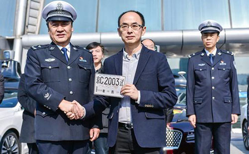 北京市公安局公安交通管理局車輛管理所副所長劉寶森向百度授予自動駕駛測試號牌