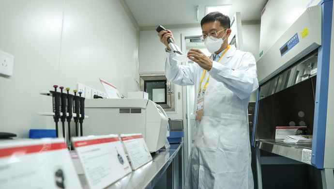 工作人員在2020進(jìn)博會的賽默飛移動方艙核酸檢測實驗室內(nèi)進(jìn)行展示。新華社發(fā)