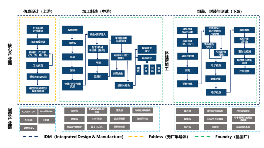 MEMS整個產(chǎn)業(yè)鏈涉及設(shè)計(jì)、制造、封裝測試、軟件及應(yīng)用方案環(huán)節(jié)。MEMS產(chǎn)業(yè)鏈的上游負(fù)責(zé)MEMS器件設(shè)計(jì)、材料和生產(chǎn)設(shè)備供應(yīng),中游生產(chǎn)制造出MEMS器件,下游使用MEMS器件制造終端電子產(chǎn)品。