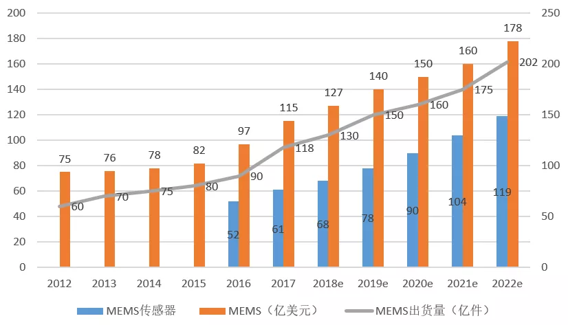 圖:全球MEMS市場規(guī)模統(tǒng)計(jì)及預(yù)測 資料來源:IC Insights