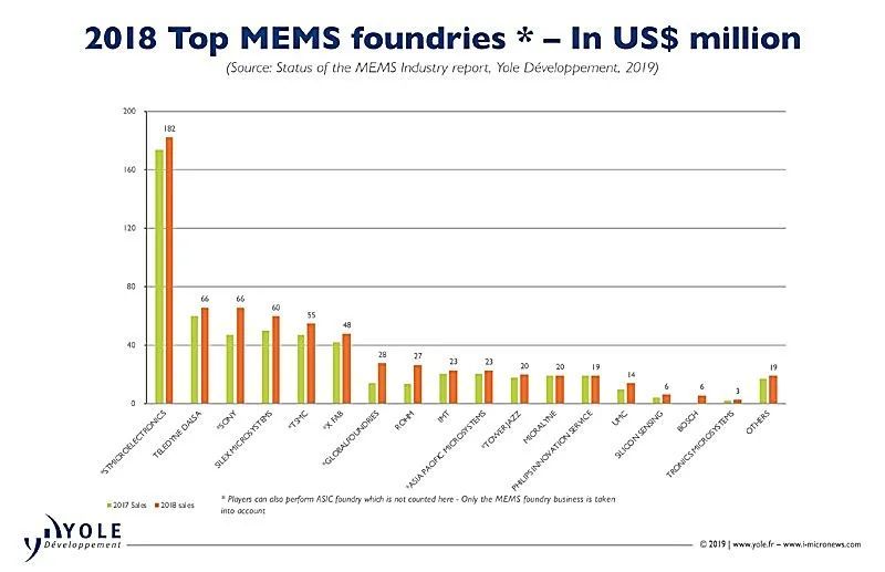 據(jù)Yole Development 發(fā)布的2018年全球MEMS代工廠發(fā)展報(bào)告,提供MEMS代工的IDM廠商主要有ST、索尼、TI等,臺積電MEMS代工業(yè)務(wù)也排在前列。從MEMS代工業(yè)務(wù)規(guī)模來看,TOP1為美國的ST,每2臺手機(jī)中就有1顆ST MEMS傳感器,其開展MEMS代工業(yè)務(wù)已有20余年。TOP2為加拿大的Teledyne DALSA,是全球最大的純MEMS 代工廠。TOP4是中國耐威科技控股公司Silex Microsystems AB,在純MEMS代工廠中排名第二。