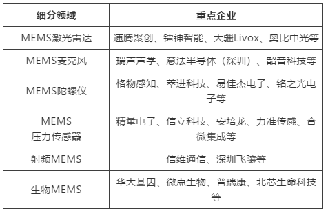 表:深圳市MEMS細(xì)分領(lǐng)域重點(diǎn)企業(yè)