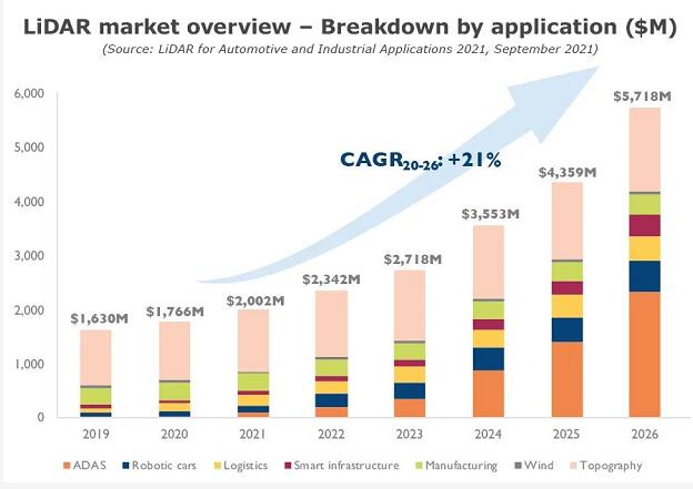 報告還顯示,到2026年,汽車與工業(yè)領域應用的激光雷達市場規(guī)模預計將達57億美元,在2020年至2026年間的年復合增長率將達到21%。到2026年,智能交通基建設施激光雷達細分市場規(guī)模預計將達3.95億美元,物流業(yè)激光雷達細分市場將達4.66億美元。值得注意的是,高級駕駛輔助系統(tǒng)(ADAS)領域在2026年的市場占比率預計將達到41%,成為激光雷達最大的細分市場,而這一數(shù)據(jù)在2020年僅為1.5%。