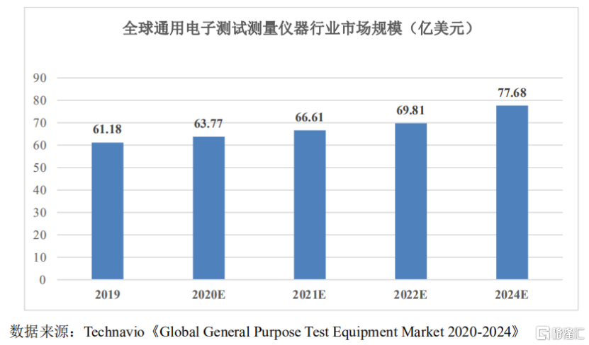 近年來,受5G信息技術(shù)發(fā)展、半導(dǎo)體、人工智能、新能源、航空航天和等行業(yè)驅(qū)動(dòng),電子測量儀器應(yīng)用領(lǐng)域不斷擴(kuò)大,全球通用電子測試測量儀器市場持續(xù)穩(wěn)增(如下圖)。據(jù)Technavio的數(shù)據(jù)顯示,2019年全球通用電子測試測量行業(yè)的市場規(guī)模為61.18億美元,預(yù)計(jì)在2024年市場規(guī)模達(dá)到77.68億美元。