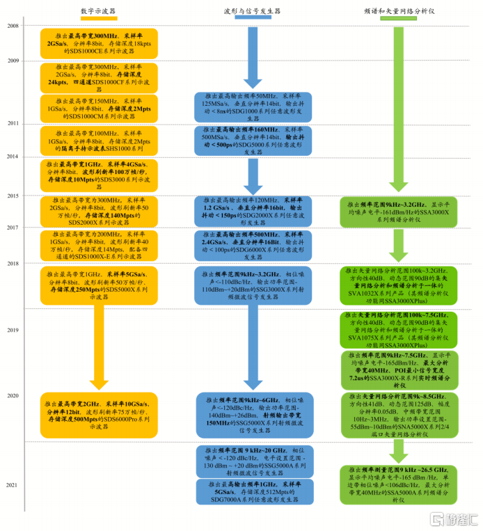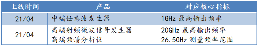 (注釋:上圖中加粗信息為相較于舊款產(chǎn)品所提升的性能或功能;最高帶寬2GHz的數(shù)字示波器于2020年9月推出;頻率范圍為8.5GHz的矢量網(wǎng)絡(luò)分析儀于2020年12月推出;最高輸出頻率為1GHz的中端任意波形發(fā)生器、最高輸出頻率為20GHz的高端射頻微波信號(hào)發(fā)生器以及測量頻率范圍為26.5GHz的高端頻譜分析儀于2021年4月推出;來源:公司招股說明書)