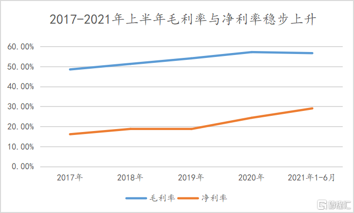 得益于產(chǎn)品結(jié)構(gòu)升級(jí),公司的盈利能力亦呈逐年穩(wěn)步上升趨勢(如下圖)。據(jù)招股書數(shù)據(jù)顯示,2017-2020年,公司的毛利率由48.15%升至57.07%;同期,公司的凈利率由16.09%升至24.33%。