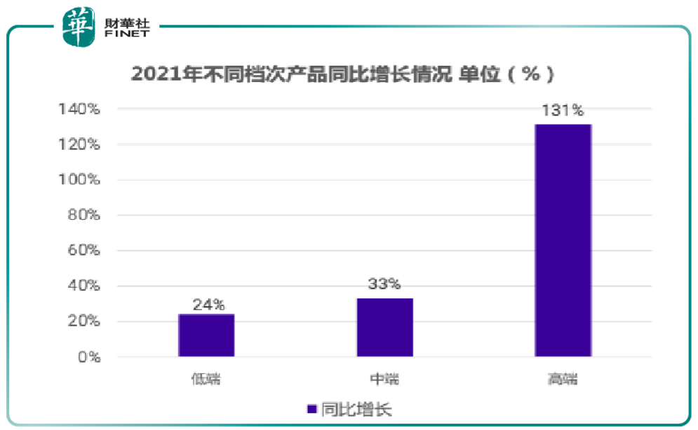 公司的高端產(chǎn)品于去年快速增長(zhǎng)。根據(jù)2021年年報(bào),不同檔次的產(chǎn)品營(yíng)收增長(zhǎng)情況如下:低端產(chǎn)品同比增長(zhǎng)24%,中端產(chǎn)品同比增長(zhǎng)33%,高端產(chǎn)品同比增長(zhǎng)131%(見下圖)。