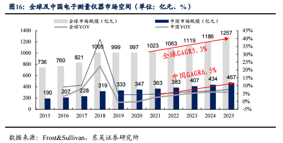 根據(jù)Frost&Sullivan,2021年全球測(cè)量?jī)x器市場(chǎng)達(dá)1023億元,隨著5G的商用化、新能源汽車滲透率提升,預(yù)計(jì)2025年市場(chǎng)空間將達(dá)1257億元,CAGR=5.3%。相較國(guó)際市場(chǎng),國(guó)內(nèi)電子測(cè)量行業(yè)增速更快,預(yù)計(jì)市場(chǎng)規(guī)模將從2021年的363億元提升至2025年的467億元,CAGR=6.5%。然而我國(guó)電子測(cè)量?jī)x器起步較晚,再加上芯片等核心元件受海外隱形技術(shù)制約,中高端產(chǎn)品長(zhǎng)期依賴進(jìn)口。