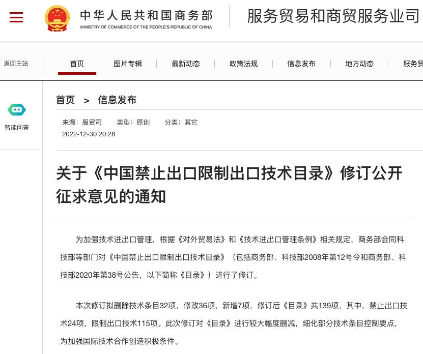 近日,???中國商務(wù)部官方網(wǎng)站發(fā)布了“關(guān)于《中國禁止出口限制出口技術(shù)目錄》修訂公開征求意見的通知”。