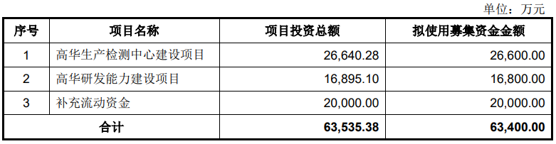 高華科技計劃募資6.34億元,其中,2.66億元用于高華生產(chǎn)檢測中心建設(shè)項目,1.68億元用于高華研發(fā)能力建設(shè)項目,2億元用于補充流動資金。