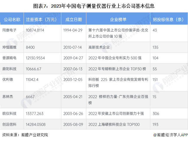 從電子測(cè)量?jī)x器行業(yè)的上市企業(yè)布局和已有公開(kāi)信息分析,注冊(cè)資本最多的是創(chuàng)遠(yuǎn)信科,而成立時(shí)間最早的是同惠電子,招投標(biāo)信息最多的則是皖儀科技。