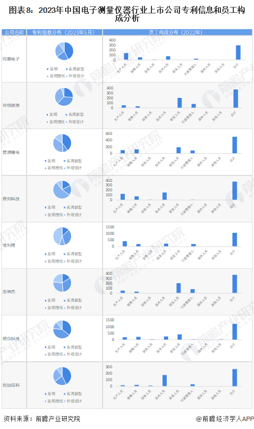 從電子測(cè)量?jī)x器行業(yè)的上市企業(yè)已有的公開(kāi)信息分析,專利信息相對(duì)較多的企業(yè)是優(yōu)利德,其中發(fā)明專利84條;員工總數(shù)最多的則是皖儀科技,員工總數(shù)為1227人;研發(fā)人員相對(duì)最多的同樣是皖儀科技,研發(fā)人員總數(shù)為429人。
