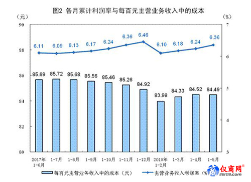 1-5月份,規(guī)模以上工業(yè)企業(yè)實(shí)現(xiàn)主營(yíng)業(yè)務(wù)收入42.9萬億元,同比增長(zhǎng)10.2%;發(fā)生主營(yíng)業(yè)務(wù)成本36.3萬億元,增長(zhǎng)9.8%;主營(yíng)業(yè)務(wù)收入利潤(rùn)率為6.36%,同比提高0.35個(gè)百分點(diǎn)。