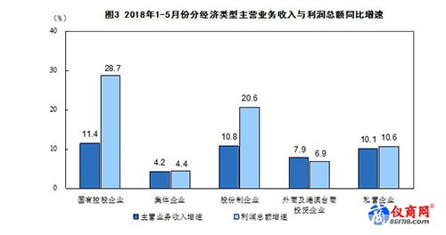 1-5月份,規(guī)模以上工業(yè)企業(yè)中,國(guó)有控股企業(yè)實(shí)現(xiàn)利潤(rùn)總額8103.5億元,同比增長(zhǎng)28.7%;集體企業(yè)實(shí)現(xiàn)利潤(rùn)總額93.1億元,增長(zhǎng)4.4%;股份制企業(yè)實(shí)現(xiàn)利潤(rùn)總額19119.8億元,增長(zhǎng)20.6%;外商及港澳臺(tái)商投資企業(yè)實(shí)現(xiàn)利潤(rùn)總額6739.1億元,增長(zhǎng)6.9%;私營(yíng)企業(yè)實(shí)現(xiàn)利潤(rùn)總額7466.2億元,增長(zhǎng)10.6%。