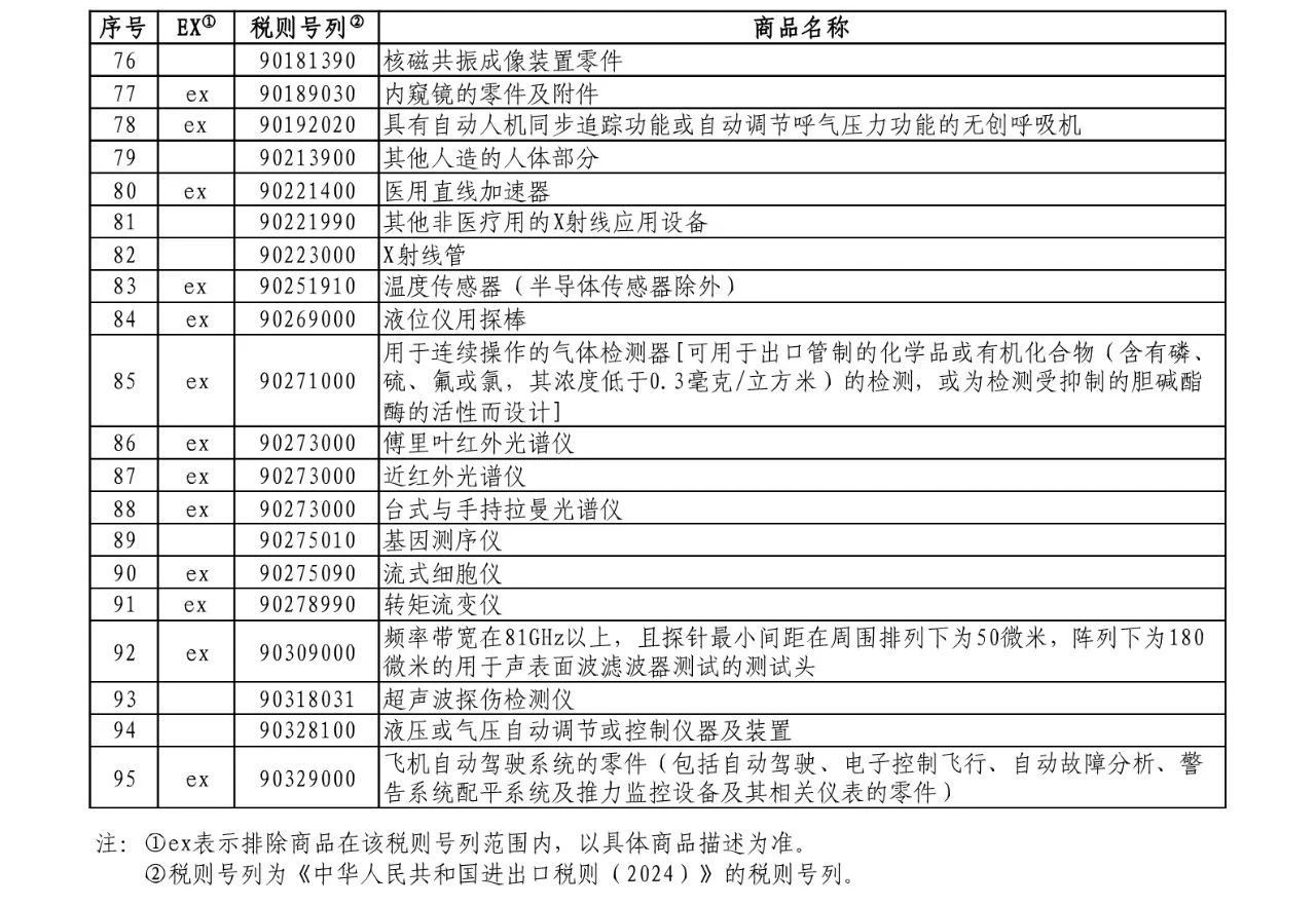 顯微鏡(光學(xué)顯微鏡除外)及衍射設(shè)備、激光器、彩色超聲波診斷儀的零件及附件、核磁共振成像裝置零件、具有自動人機(jī)同步追蹤功能或自動調(diào)節(jié)呼氣壓力功能的無創(chuàng)呼吸機(jī)、醫(yī)用直線加速器、內(nèi)窺鏡的零件及附件、其他非醫(yī)療用的X射線應(yīng)用設(shè)備、X射線管、溫度傳感器(半導(dǎo)體傳感器除外)、液位儀用探棒、用于連續(xù)操作的氣體檢測器、傅里葉紅外光譜儀、近紅外光譜儀、臺式與手持拉曼光譜儀、基因測序儀、流式細(xì)胞儀、轉(zhuǎn)矩流變儀、超聲波探傷檢測儀、液壓或氣壓自動調(diào)節(jié)或控制儀器及裝置