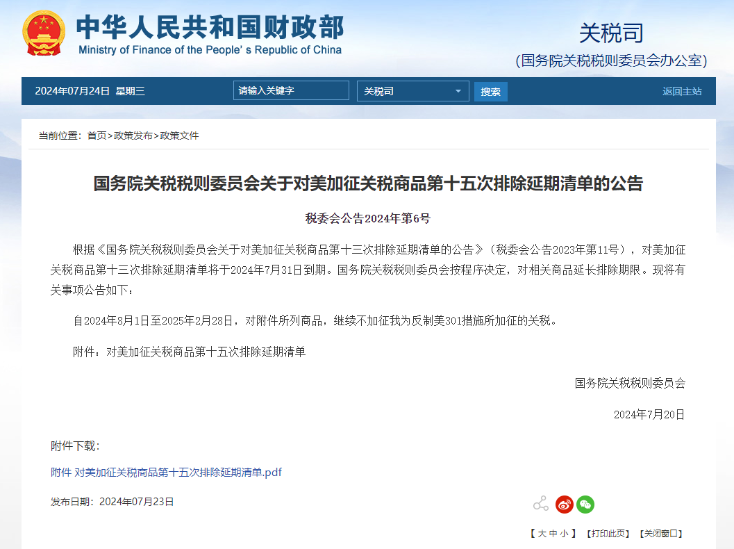 據(jù)財政部消息,國務(wù)院關(guān)稅稅則委員會公布對美加征關(guān)稅商品第十五次排除延期清單。對95項商品延長排除期限,自2024年8月1日至2025年2月28日,繼續(xù)不加征我為反制美301措施所加征的關(guān)稅。