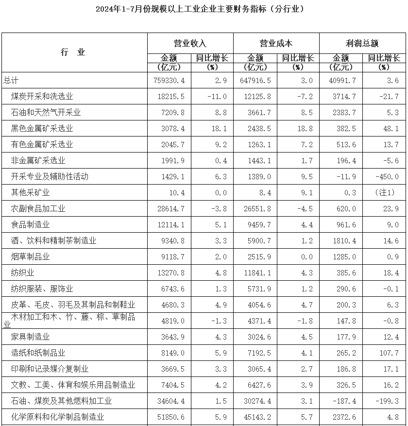 1-7月份,規(guī)模以上工業(yè)企業(yè)實(shí)現(xiàn)營(yíng)業(yè)收入75.93萬億元,同比增長(zhǎng)2.9%;發(fā)生營(yíng)業(yè)成本64.79萬億元,增長(zhǎng)3.0%;營(yíng)業(yè)收入利潤(rùn)率為5.40%,同比提高0.04個(gè)百分點(diǎn)。